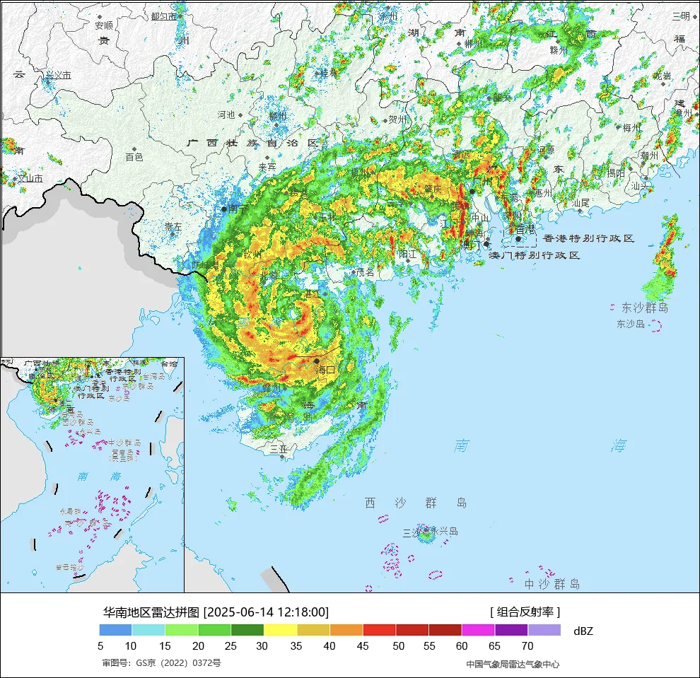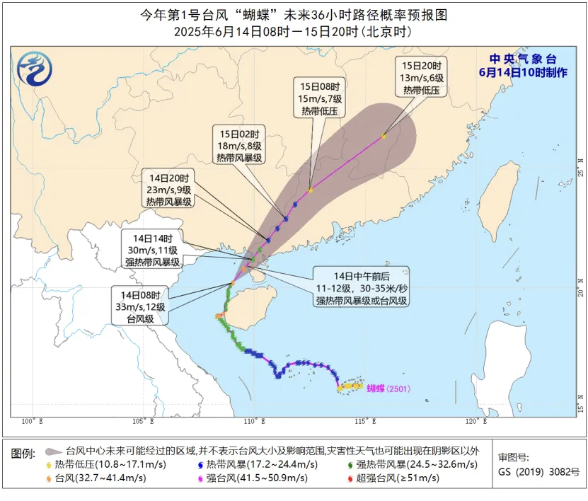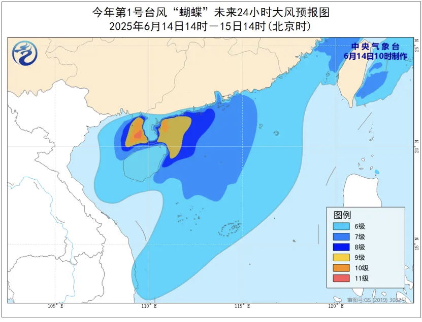 大风预报方面,6月14日14时至15日14时,南海西部、北部湾、琼州海峡、西沙群岛、中沙群岛、海南岛沿海、广东中西沿海、广西沿海、雷州半岛将有6至8级风,阵风9至10级,部分地区风力有9至10级,台风中心经过的海域或地区风力可达11至12级,阵风13至14级。